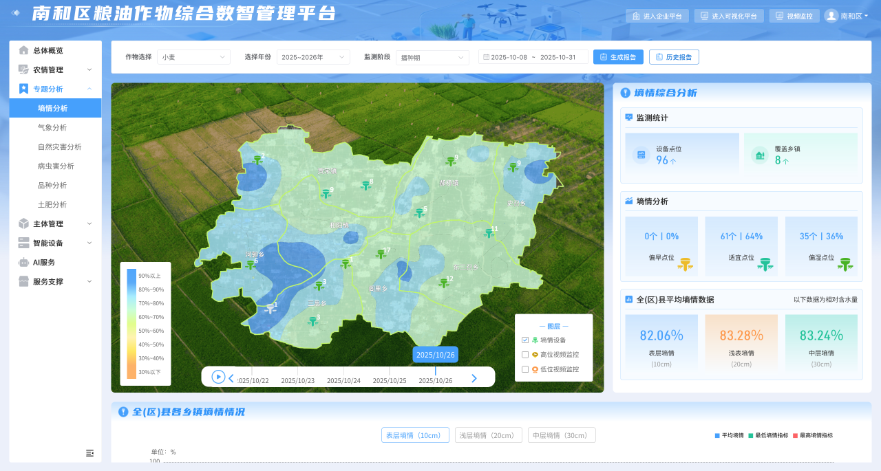 针对当前黄淮海地区小麦播种面临的偏涝难题,平台依托 AI 墒情模型发挥了关键作用。通过实时监测土壤墒情、整合气象数据、分析土壤类型与养分状况,并结合当地历史播种习惯,平台生成精准播种期报告,不仅明确了当前的播种进度及偏涝影响,还智能推荐适宜品种、最佳播种时间和播种深度,为小麦抗湿晚播提供了科学决策依据,有效破解了晚播应变的技术难题。