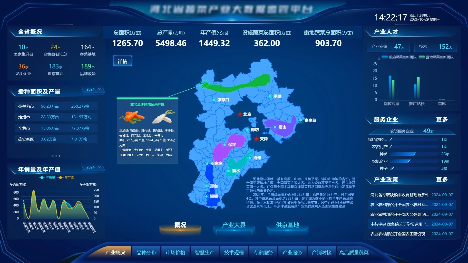 整合基础数据与实时数据,实现产业概况、品种分布、供京基地等精准管控,为产业决策提供数据支撑。