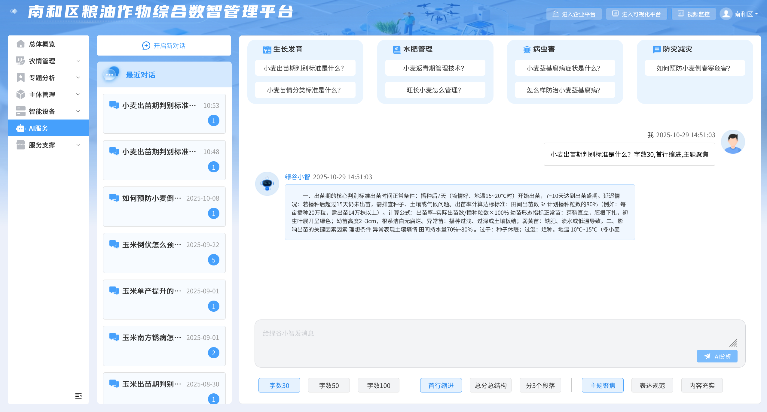此次在全国性农业会议上的汇报,是对绿谷智慧数智农业技术的高度认可。南和区粮油作物综合数智管理平台以 “实时监测、智能分析、精准服务” 为核心,直击晚播小麦生产中的痛点难点,为抗湿晚播、应变栽培提供了可复制、可推广的数智解决方案。