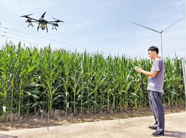 “起飞!”随着螺旋桨转动,一架多光谱无人机缓缓升空。在田垄边,技术人员熟练地操作无人机对玉米地进行智慧巡检。
