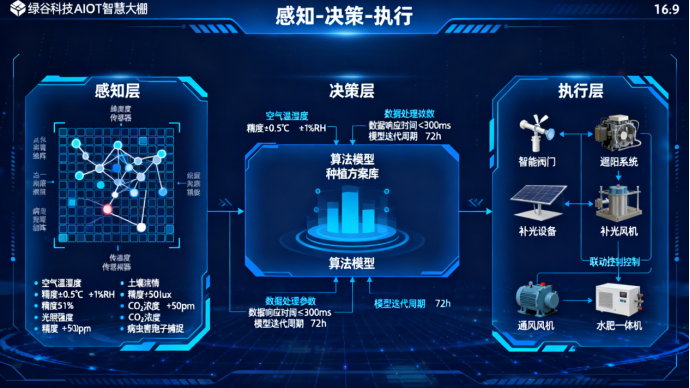 “绿谷智慧的核心竞争力,在于将AIOT技术与农业种植逻辑深度耦合。”任腾飞表示,“平台以AIOT物联网网关为核心,部署了覆盖空气温湿度、土壤墒情、光照强度、CO₂浓度及病虫害孢子捕捉的多维度传感器矩阵,实现数据采集精度达±0.5℃、±1%RH,传输延迟≤300ms的实时监测;基于百万级种植数据训练的专属算法模型,能精准识别环境异常、病虫害特征,提前24-48小时发出智能预警,并联动智能阀门、遮阳系统、补光设备等实现毫秒级智能控制。”